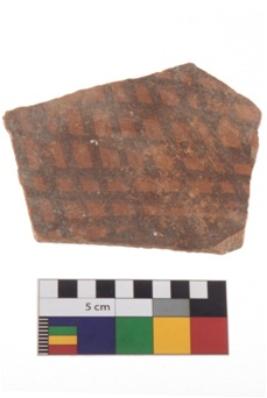 | Description / विवरण | Specimen of potsherd with black decorative geometric Net Pattern painting . |