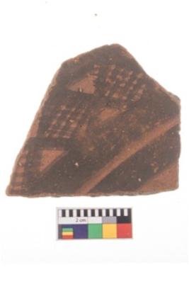 | Description / विवरण | Specimen of potsherd with black decorative geometric Net Pattern painting . |