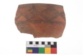 | Description / विवरण | Specimen of potsherd with black decorative geometric diamond set broad horizontal bands painting . |
