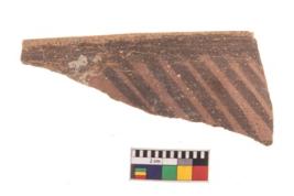 | Description / विवरण | Specimen of black on red ware with decorative geometric Groups of oblique strokes set in horizontal bands on the exterior painting. |