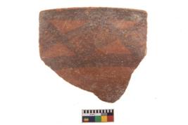 | Description / विवरण | Specimen of black on red ware with decorative geometric A row of latticed diamonds set in horizantal bands but having groups of oblique lines at intervals painting. |
