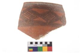 | Description / विवरण | Specimen of potsherd with black decorative geometric diamond set broad horizontal bands painting . |