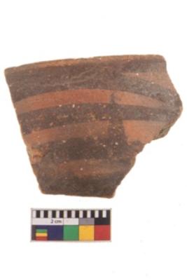 | Description / विवरण | Specimen of black on red ware with decorative geometric Its decorated with two horizontal bands with sets of triple arches painting. |