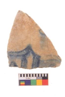 | Description / विवरण | A specimen of a glazed ware potsherd with bluish painting on a single sided glossy surface. |