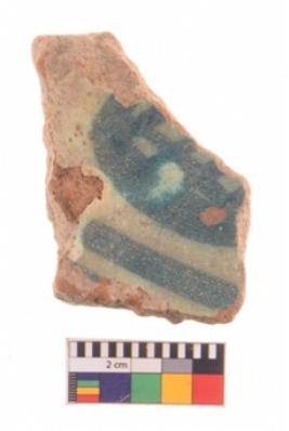 | Description / विवरण | A specimen of a glazed ware potsherd with bluish painting over it. |