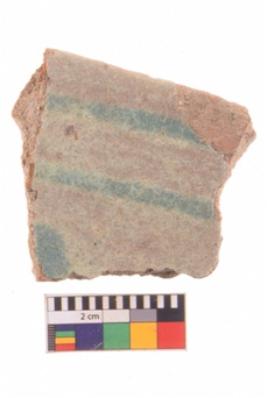 | Description / विवरण | A specimen of a glazed ware potsherd with bluish painting over it. |