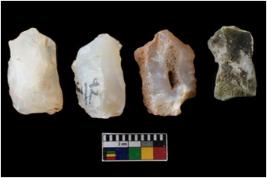 | Description / विवरण | There are n-4 of intact cores. Out of them 1 is made up Chalcedony and 3 are made up of Chert.There are multidirectional irregular dominant scar pattern on both dorsal and ventral face of the cores. |
