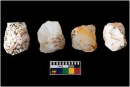 | Description / विवरण | There are n-4 of intact cores. Out of them 1 is made up Chalcedony and 3 are made up of Chert.There are multidirectional irregular dominant scar pattern on both dorsal and ventral face of the cores. |