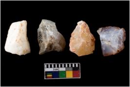 | Description / विवरण | There are n-4 of intact cores. Out of them 1 is made up Chalcedony and 3 are made up of Chert.There are multidirectional irregular dominant scar pattern on both dorsal and ventral face of the cores. |