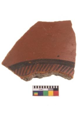 | Description / विवरण | Specimen of potsherd with black decorative geometric painting. Type Black on Red Ware . |