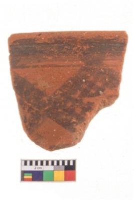 | Description / विवरण | Specimen of black on red ware with decorative geometric A row of latticed diamonds set in horizontal bands but having groups of oblique lines at intervals painting. |