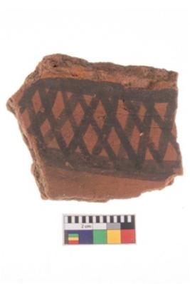 | Description / विवरण | Specimen of potsherd with black decorative geometric painting . |