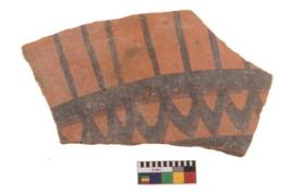 | Description / विवरण | Specimen of potsherd with black decorative geometric painting. Type Black on Red Ware . |