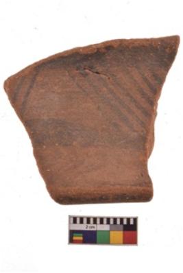 | Description / विवरण | Specimen of black on red ware with decorative geometric Groups if oblique stroks set in horizontal bands on the exterior painting. |