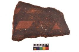 | Description / विवरण | Specimen of black on red ware with decorative geometric A row of latticed diamonds set in horizontal bands but having groups of oblique lines at intervals painting. |