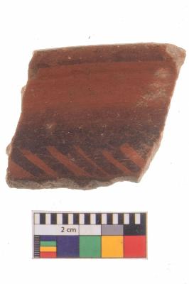| Description / विवरण | Specimen of potsherd with decorative geometric Linear Pattern painting, Type Black on Red Ware . |