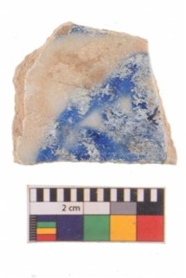 | Description / विवरण | A specimen of a glazed ware potsherd with bluish painting over it. |