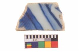 | Description / विवरण | A specimen of a glazed ware potsherd with bluish painting over it. |