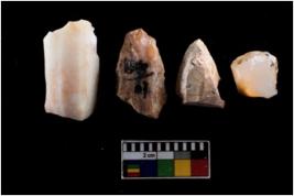 | Description / विवरण | There are n-4 of intact cores. Out of them 1 is made up Chalcedony and 3 are made up of Chert.There are multidirectional irregular dominant scar pattern on both dorsal and ventral face of the cores. |
