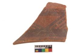 | Description / विवरण | Specimen of black on red ware with decorative geometric Groups if oblique strokes set in horizontal bands on the exterior painting. |