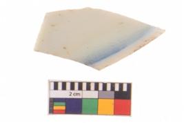 | Description / विवरण | A specimen of a glazed ware potsherd with faint bluish painting over it. |