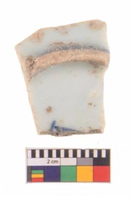 | Description / विवरण | A specimen of a glazed ware potsherd with traces of bluish painting over it. |