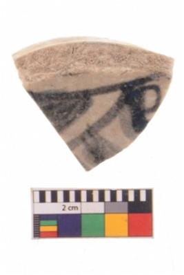 | Description / विवरण | A specimen of a glazed ware potsherd with black painting over it. |