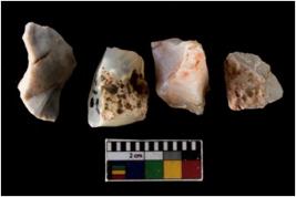 | Description / विवरण | There are n-4 of intact cores. Out of them 1 is made up Chalcedony and 3 are made up of Chert.There are multidirectional irregular dominant scar pattern on both dorsal and ventral face of the cores. |
