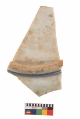 | Description / विवरण | A specimen of a glazed ware potsherd with traces of bluish painting over it. |
