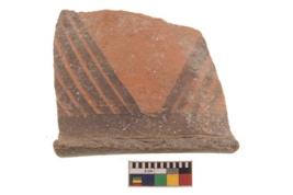 | Description / विवरण | Specimen of black on red ware with decorative geometric Groups if oblique stroks set in horizontal bands on the exterior painting. |
