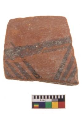 | Description / विवरण | Specimen of black on red ware with decorative geometric Groups if oblique stroks set in horizontal bands on the exterior painting. |