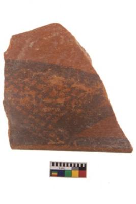 | Description / विवरण | Specimen of black on red ware with decorative geometric A row of latticed diamonds set in horizontal bands but having groups of oblique lines at intervals painting. |