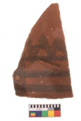 | Description / विवरण | Specimen of black on red ware with decorative geometric A row of arches over a horizontal band painting. |