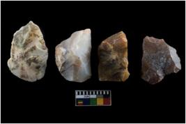| Description / विवरण | There are n-4 of intact cores. Out of them 1 is made up Chalcedony and 3 are made up of Chert.There are multidirectional irregular dominant scar pattern on both dorsal and ventral face of the cores. |