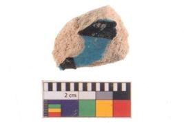 | Description / विवरण | A specimen of a glazed ware potsherd with bluish painting over it. |