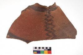 | Description / विवरण | Specimen of black on red ware with decorative black pigment, zigzag pattern . |