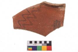 | Description / विवरण | Specimen of black on red ware with decorative black pigment, zigzag pattern . |