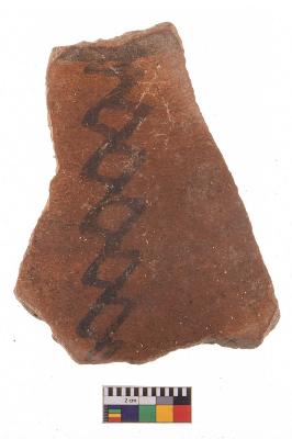 | Description / विवरण | Specimen of black on red ware with decorative black pigment, zigzag pattern . |