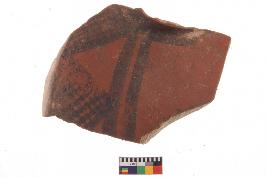 | Description / विवरण | Specimen of potsherd with decorative geometric Diamond set broad horizontal bands painting, Type Black on Red Ware . |