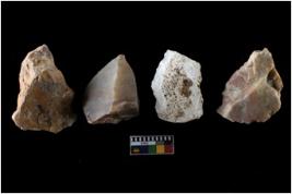 | Description / विवरण | There are n-4 of intact cores. Out of them 1 is made up Chalcedony and 3 are made up of Chert.There are multidirectional irregular dominant scar pattern on both dorsal and ventral face of the cores. |