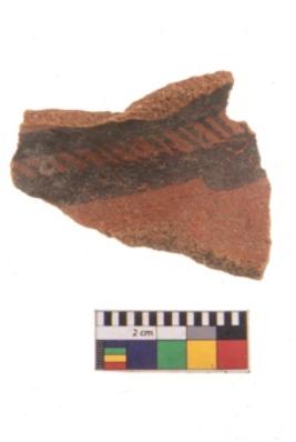 | Description / विवरण | Specimen of potsherd with black decorative geometric painting. Type Black on Red Ware . |