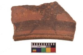 | Description / विवरण | Specimen of black on red ware with decorative geometric A row of latticed diamonds set in horizontal bands but having groups of oblique lines at intervals painting. |