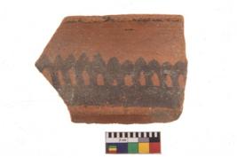 | Description / विवरण | Specimen of potsherd with black decorative geometric painting. Type Black on Red Ware . |