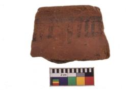 | Description / विवरण | Specimen of black on red ware with decorative geometric Vertical stroks set in two horizontal bands painting. |