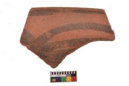 | Description / विवरण | Specimen of black on red ware with decorative geometric Its decorated with two horizontal bands with sets of triple arches painting. |