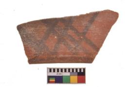 | Description / विवरण | Specimen of black on red ware with decorative geometric Two horizontal bands containing criss-cross pattern painting. |