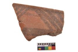 | Description / विवरण | Specimen of black on red ware with decorative geometric Groups of oblique strokes set in horizontal bands on the exterior painting. |