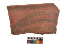 | Description / विवरण | Specimen of black on red ware with decorative geometric Its decorated with two horizontal bands with sets of triple arches painting. |