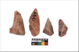 | Description / विवरण | It made up of a short flakes with sides trimmed. Marks of secondary flaking are present on the both the faces. It rained pebbly cortex on one side and irregular thin edge on the other. The dorsal is relatively flat. A patch of cortex near the section which is slanting to the dorsal .It is sub rectangular in shaped. |