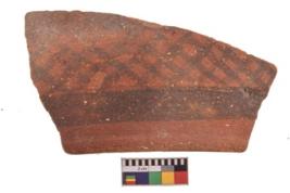 | Description / विवरण | Specimen of black on red ware with decorative geometric Two horizontal bands containing criss-cross pattern painting. |